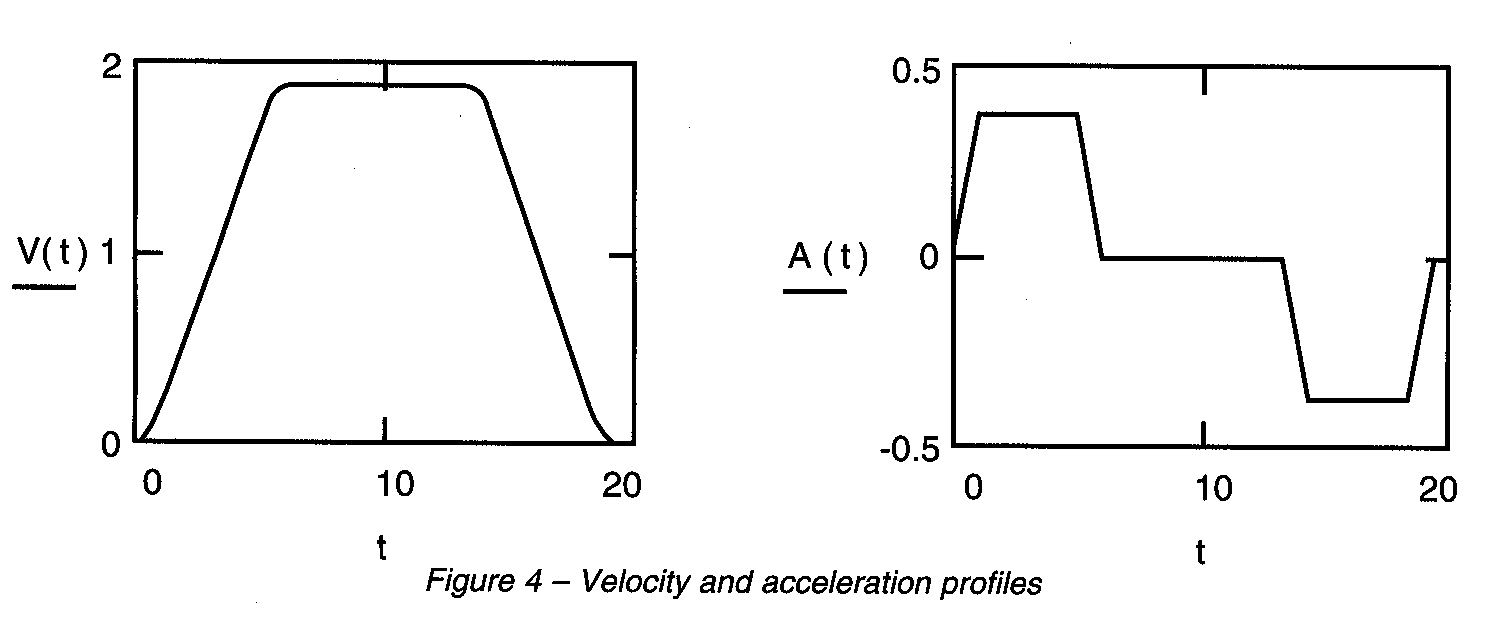 Complete equations for plotting the motion or kinematics of a lift were presented by Peters(5). There are about 100 equations, so for brevity, they have not been reproduced in this paper. Applying these equations, a sample journey can be defined. We require velocity and acceleration profiles for the motor model, which can be plotted as follows in Figure 4.