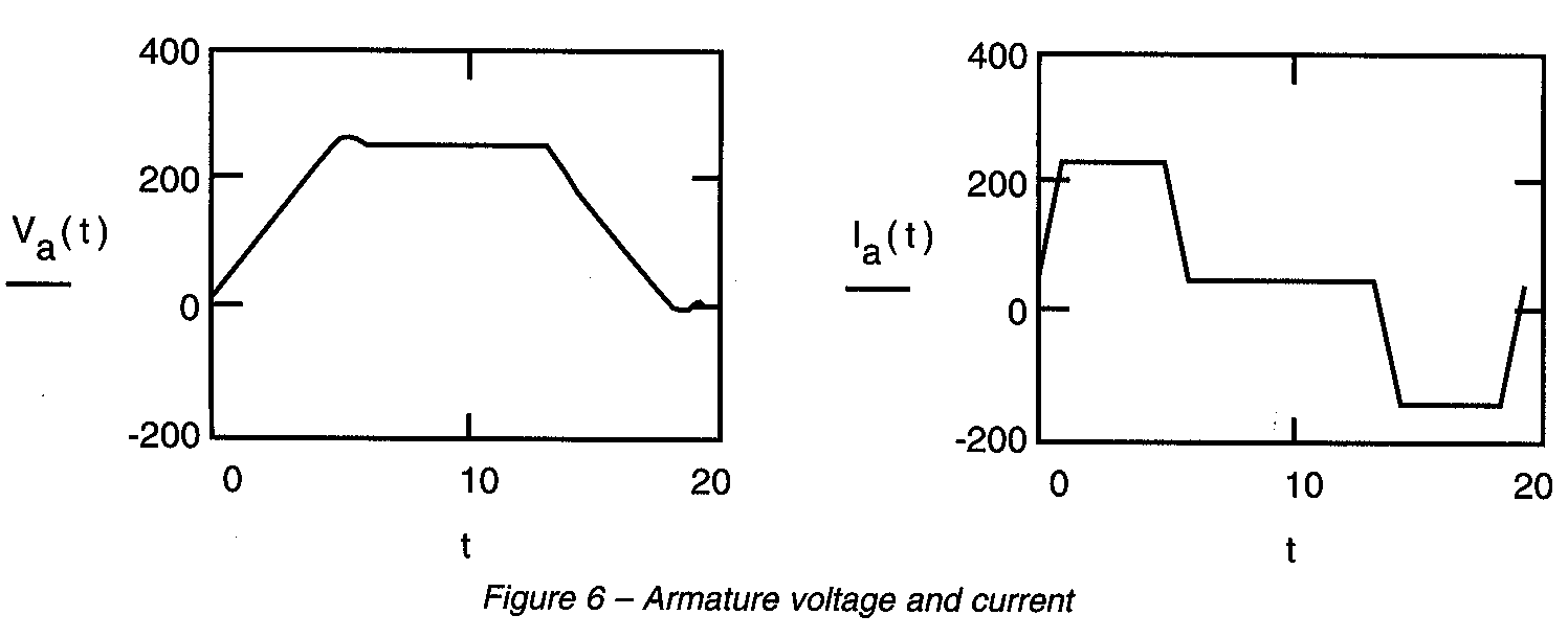 This section has been prepared using Mathcad. Results are calculated and plotted directly from the equations entered in standard mathematical notation. The drive being modelled has a separately excited DC motor, fed from a fully controlled six-pulse converter. Input parameters have been chosen to correspond with the noted reference (3).
