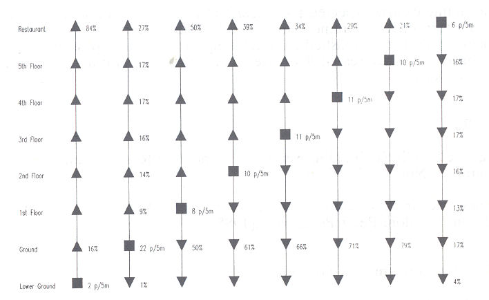 Figure 4 Summation of lunchtime peak passenger flows for office block with restaurant on top floor
