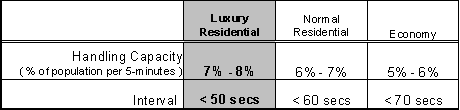 Requirements on elevator performance specify that the elevators must be able to handle a certain peak volume of two-way traffic (called Handling Capacity) while maintaining a certain Interval. While the actual parameter values for performance requirements are a matter of opinion, the table below is representative of such requirements which appear in public literature, various elevator supplier’s internal documents, and consultant’s specification documents.