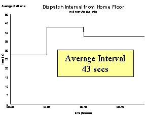 Elevate simulation experiments were run for several 20-minute periods and the following results were observed. Average Passenger Waiting Time was 11.7 seconds, and the Average Interval was 43 seconds. These results are shown in graphical form in Figure 3.