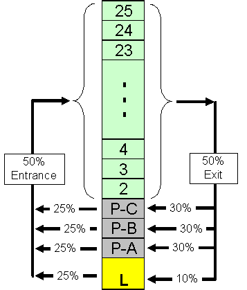 With a single entrance, the example in Section 3 is clearly the simplest of traffic scenarios. It is not totally out of the question to expect that a luxury residential building will have parking garage levels within the structure. Therefore, we took the 25-story example and added three levels of above ground parking. We assume that the same requirements would apply … peak two-way traffic at 8% with half of the traffic returning to the building and the other half leaving the building. The important difference, however, is that now there are four different levels of entrance and exit: main Lobby and parking levels P-A, P-B, and P-C. It is now incumbent on us to determine the distribution of traffic to and from each level. With reference to Figure 4, we assume somewhat arbitrarily that entrance traffic is divided equally amongst the four levels. In contrast, the exit traffic is assumed to be different where only 10% of exiting passengers use the main Lobby level. This reflects the situation where many fewer people leave the building by walking out on foot from the main Lobby than by automobile from the parking levels.