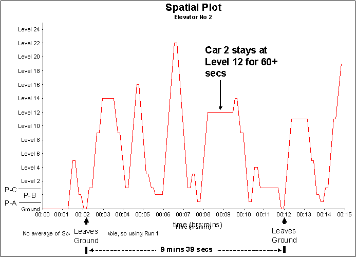 The Elevate software has been designed to “log” departures of cars from the main Lobby level and then calculate the average time between such events. The problem can readily be seen with reference to Figure 6, which shows the positions of Car 2 during the 20-minute simulation. This