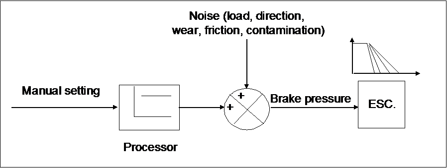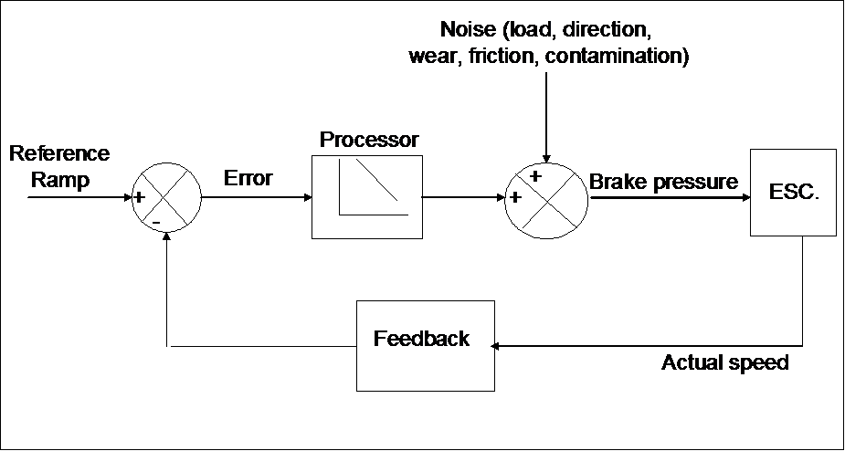In effect, a conventional braking system is a form of open loop (or feed-forward) control system, as shown in Figure 1. Although it is set to a certain value, any variation in the ‘noise’ parameters would lead to large variations in output. The output in this case is both the value of deceleration and the value of stopping distance.