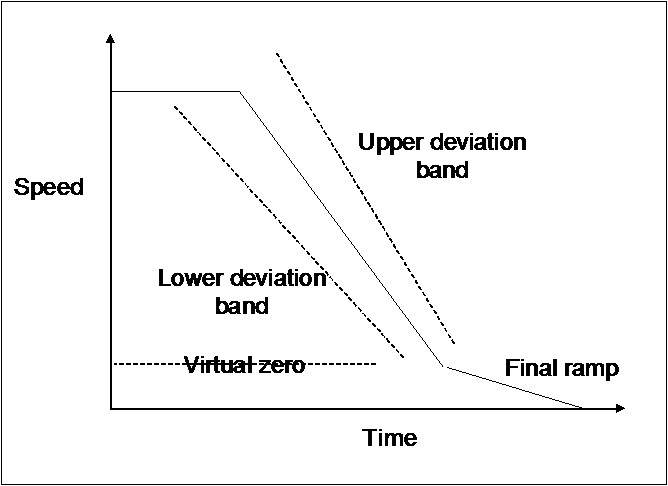 The system has internal preset deviation bands (above and below the speed profile). When the speed profile hits one of those deviation bands, the system acts to reduce or increase the pressure in order to alter the braking effort and correct the deviation. The band becomes narrower the lower the speed (Figure 4). When the speed gets to a predetermined value called the virtual zero, the system then moves to a constant ramp to achieve the final stop.