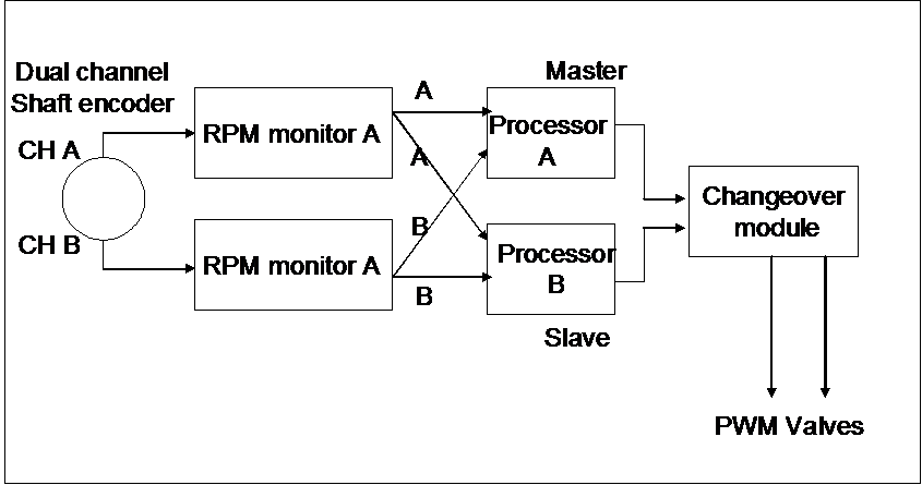 The intelligent braking system comprises two parallel channels fed from the same shaft encoder. The shaft encoder has two channels (A and B) that are square waves 90 degrees out of phase. These are called quadrature channels and allow the system to detect the direction of rotation. The two signals from the shaft encoder are fed into two speed sensor modules that check for overspeed/underspeed. The two signals are then fed to the two identical processing boards. As each board receives both signals A and B, they can detect the direction of rotation.