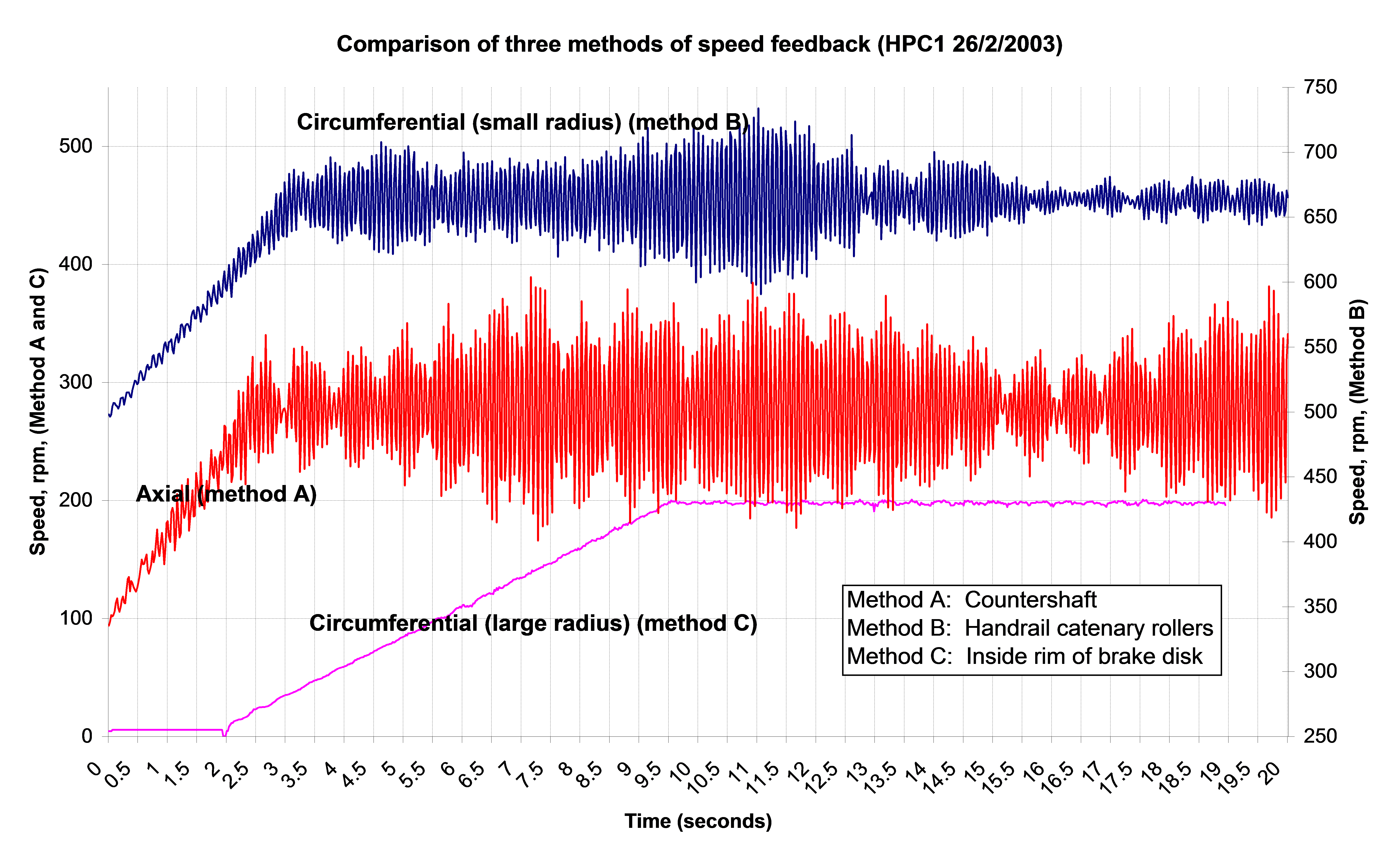 One of the main problems that was encountered during the testing was the quality of the feedback signal. A shaft encoder was used to feed back the rotational movement of the escalator top shaft. The shaft encoder was mechanically linked to a countershaft on the escalator. The quality of the signal was very poor, with a significant amount of noise superimposed on the speed feedback signal.