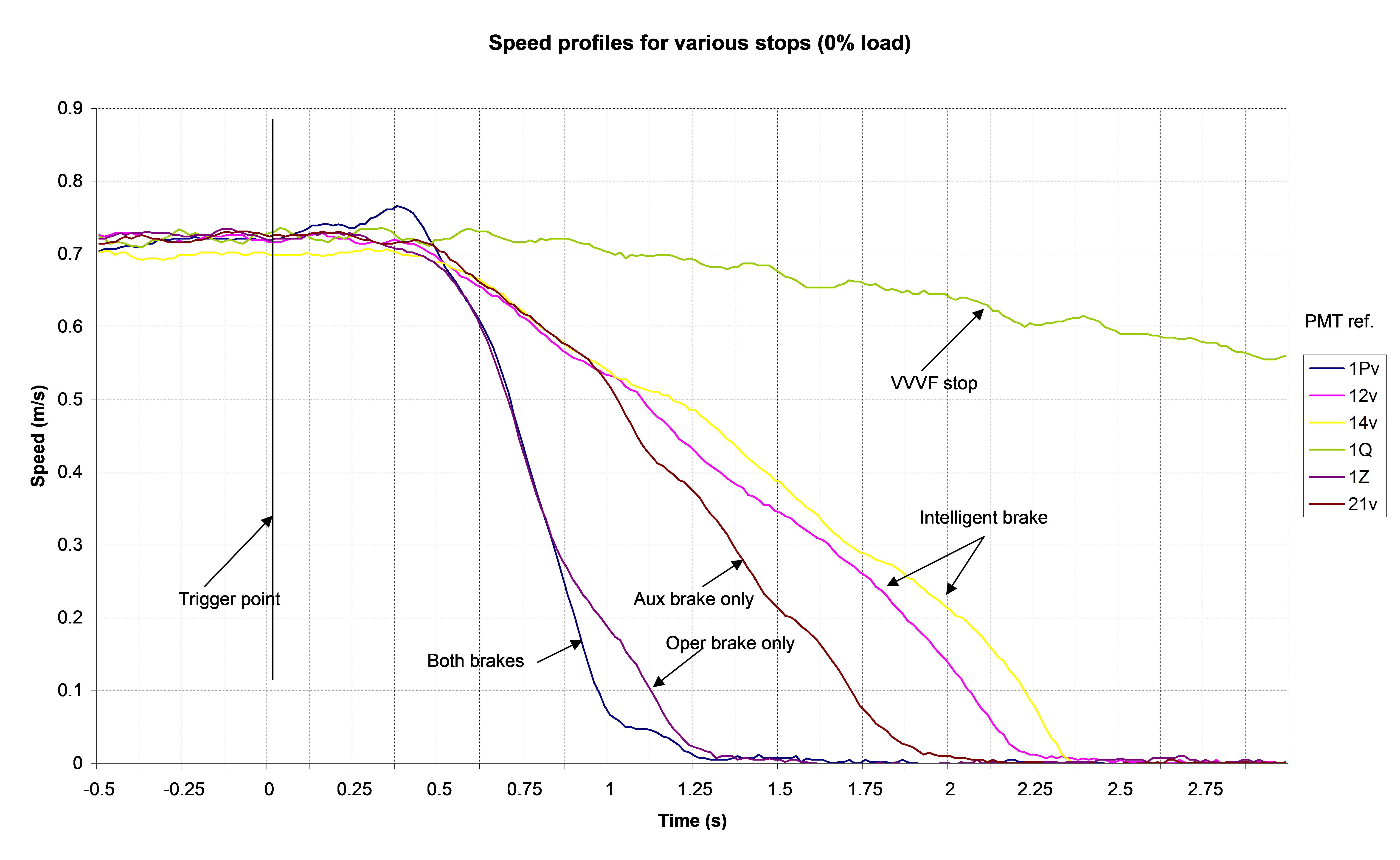 The tests results are shown in graphical format in Figure 9 (that shows the comparison between conventional stops and intelligent braking stops at no load) and in Figure 10 (that shows the no load to full load variation of the intelligent braking system).