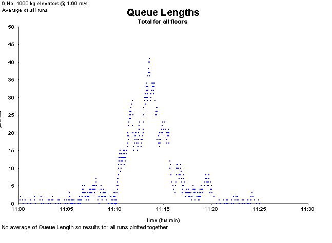 Queue Lengths shows how many people are waiting at elevator landings. This graph is plotted as a scatter diagram. Each time the queue length changes, another dot is plotted.