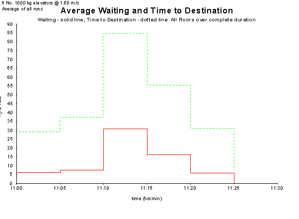 The Average Waiting Time and Time to Destination graph is plot for each 5 minutes. The lower line is the Average Waiting Time. The upper line is the Time to Destination. The difference between the two lines is the Passenger Transit Time.